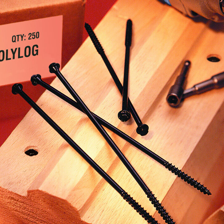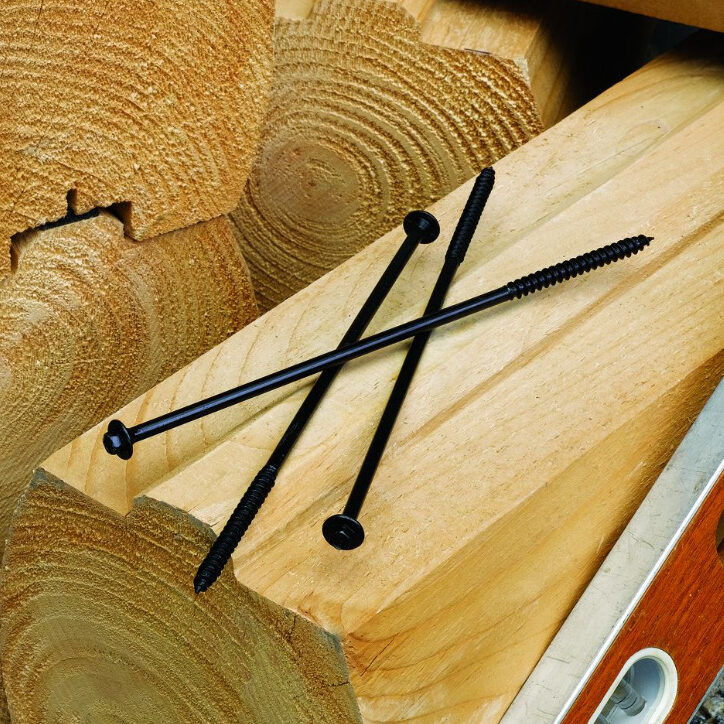 Variety of log home fasteners for specific needs including OlyLog®, LogHog®-SR Settling Resistant fastener, and LogHog® heavy-duty fastener.